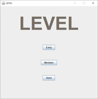 Class yang digunakan untuk menampilkan GUI untuk memilih level kesulitan dalam game yang berisi panel yang dapat diklik untuk memilih level easy, medium, dan hard. Sehingga jika panel easy diklik maka akan memanggil class easy, jika panel medium diklik maka akan memanggil class medium, jika panel hard diklik maka akan memanggil class hard